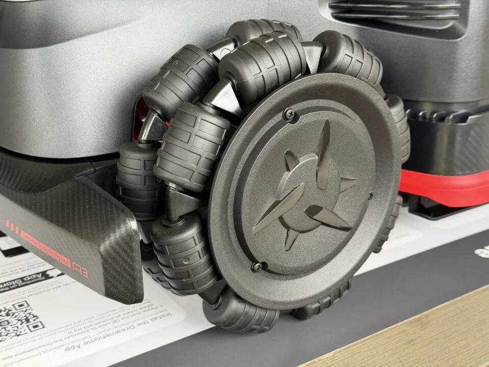 Najbardziej wyróżniają się oczywiście masywne koła, każde z nich ma wbudowany silnik. Projektanci postanowili połączyć dwa koła wielokierunkowe z dwoma kołami terenowymi, a taki zestaw umożliwia obrót w miejscu, czyli zerowy promień skrętu, co zwiększa zwrotność i skuteczność koszenia nawet w bardzo ciasnych zakamarkach ogrodu.