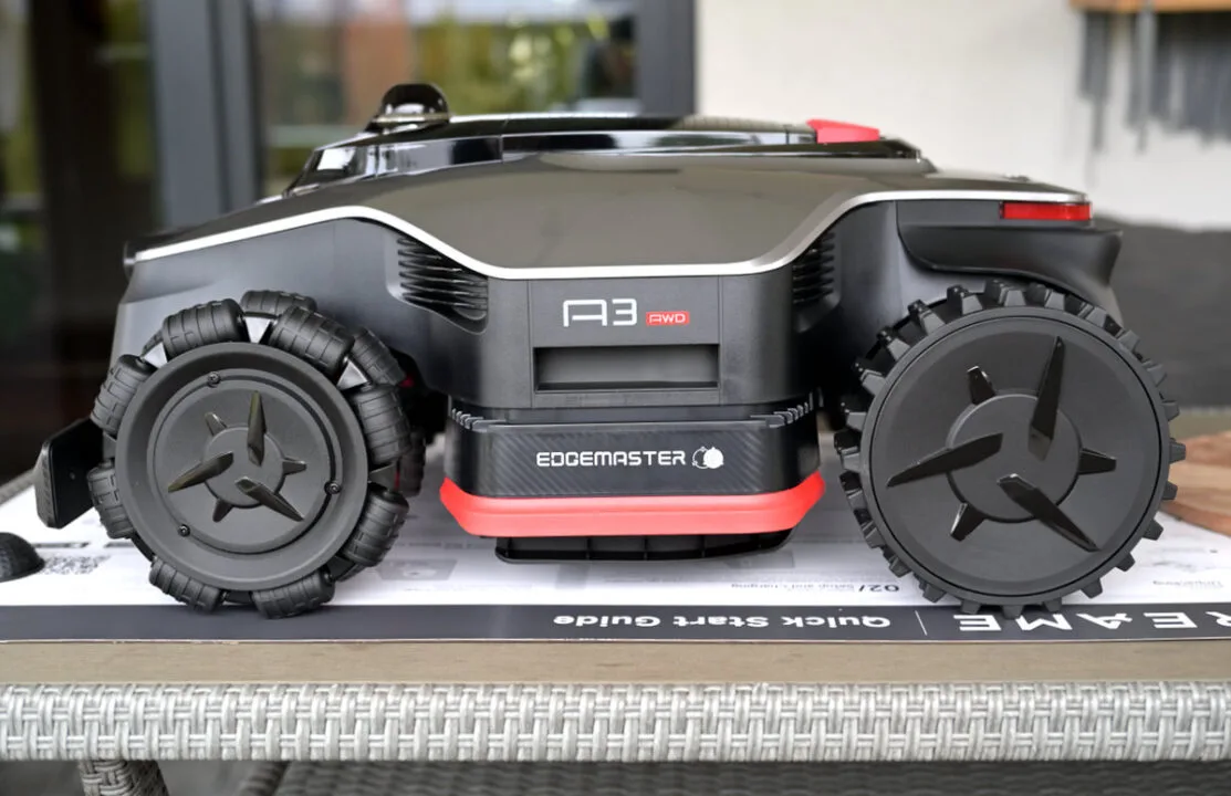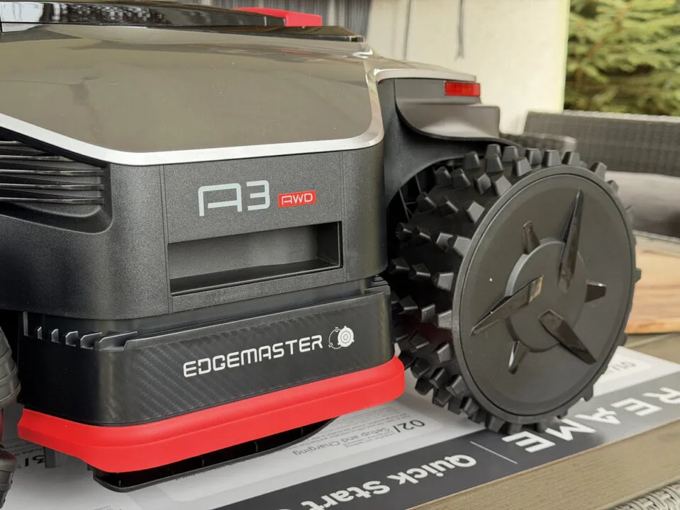 Może tego nie widać, ale mamy do czynienia z dość dużym robotem koszącym, to zrozumiałe. Dwie niezależne tarcze tnące o łącznej szerokości 40 cm, mocna bateria, terenowe zawieszenie – to wszystko musi się gdzieś zmieścić. Przy okazji wspomnę, że Dreame A3 AWD Pro waży 24.5 kg. Samodzielne przenoszenie robota może być zatem dla niektórych wyzwaniem.
