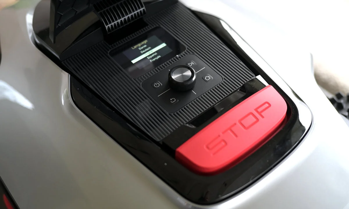 Najwyżej osadzonym elementem na obudowie jest LiDAR, który w połączeniu z kamerą AI skanuje otoczenie w pełnym zakresie 360°, osiągając zasięg nawet 70 metrów i dokładność sięgającą 1 cm. Na górze mamy też duży przycisk STOP, czujnik deszczu oraz klapkę pozwalającą dostać się do pokrętła sterującego i wyświetlacza.