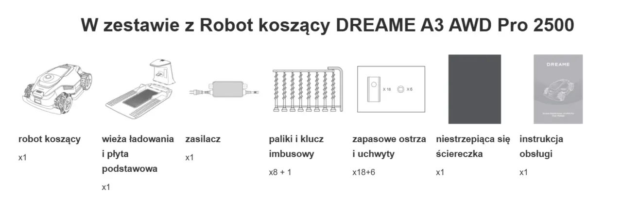 Zestaw zawiera wszystkie niezbędne elementy: wieża ładowania z 10-metrowym kablem i płyta podstawy, zasilacz, specjalne wkręty do montażu podstawy wraz z kluczem imbusowym, ściereczka do wycierania LiDAR’u i instrukcja obsługi. Są też materiały eksploatacyjne – aż 18 zapasowych ostrzy i 6 uchwytów.