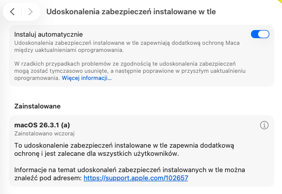 Jeśli zobaczyliście powiadomienie o aktualizacji, a w ustawieniach nie było widocznej kolejnej wersji systemu – to był właśnie ten mechanizm w praktyce. Apple ostrzega przy tym, by nie usuwać tych aktualizacji ręcznie! Ich dezinstalacja powoduje cofnięcie wszystkich wcześniejszych poprawek, co obniża poziom zabezpieczeń urządzenia.