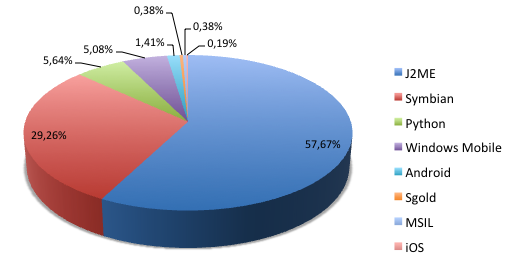 Rosnąca popularność Androida skupiła uwagę cyberprzestępców. W sierpniu 2010 r. wykryto pierwszego szkodnika atakującego system firmy Google. Warto wspomnieć, że do tej pory odnotowano 15 takich programów należących do 7 różnych rodzin. W omawianym okresie pojawiły się również pierwsze zagrożenia atakujące system iOS firmy Apple, jednak infekowały tylko urządzenia, na których dokonano tzw. jailbreaka w celu instalowania aplikacji spoza oficjalnego sklepu Apple. Najpopularniejszym celem ataków zagrożeń mobilnych nadal jest platforma Java 2 Micro Edition (J2ME), którą obsługuje ogromna liczba urządzeń przenośnych. To oznacza, że zagrożone są nie tylko smartfony, ale również zwykłe telefony komórkowe. Drugą najczęściej infekowaną platformą jest Symbian, natomiast na trzecim miejscu znajduje się Python.