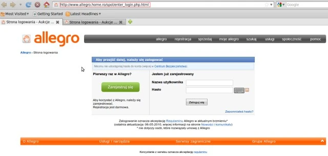 Sfałszowana strona logowania do portalu Allegro.pl