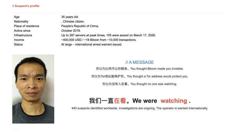 Europejscy śledczy nie ujawnili nazwiska chińskiego podejrzanego, ale opublikowali jego zdjęcie i poinformowali, że wydano wobec niego międzynarodowy nakaz aresztowania. Większość serwerów z których korzystał podejrzany była hostowana w Niemczech. Co istotne, infrastruktura była rozproszona i niezwykle trudna do wykrycia. Jak podkreślają śledczy, liczba i różnorodność domen sprawiały, że tradycyjne metody analizy były niewystarczające.