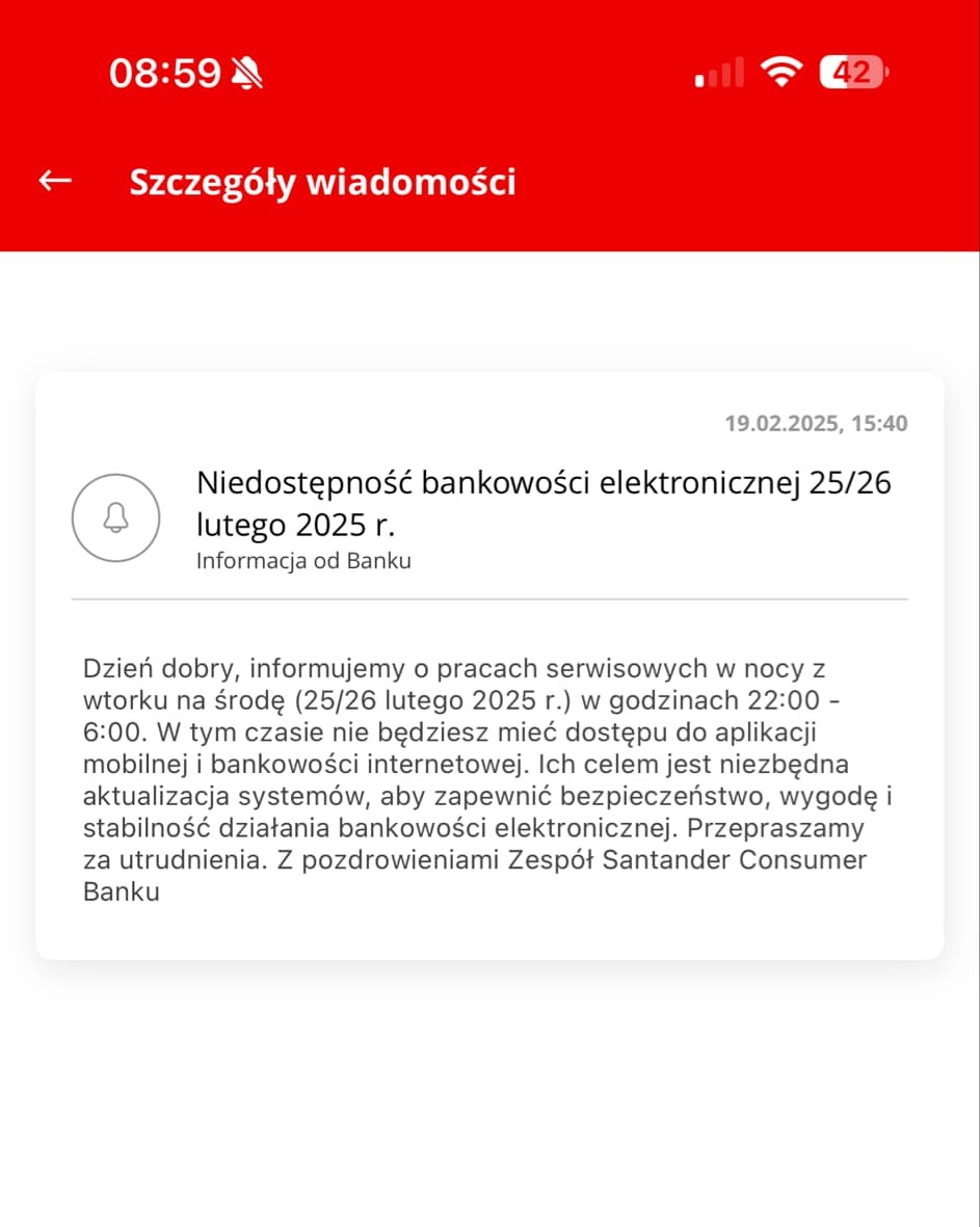 Niedostępność bankowości elektronicznej w Santander Consumer Banku zaplanowano na 25/26 lutego 2025 roku. Poinformowano, że prace serwisowe w „banku od kredytów”, jak zwykł się określać SCB, potrwają w godzinach 22:00 – 6:00 od 25 do 26 lutego.