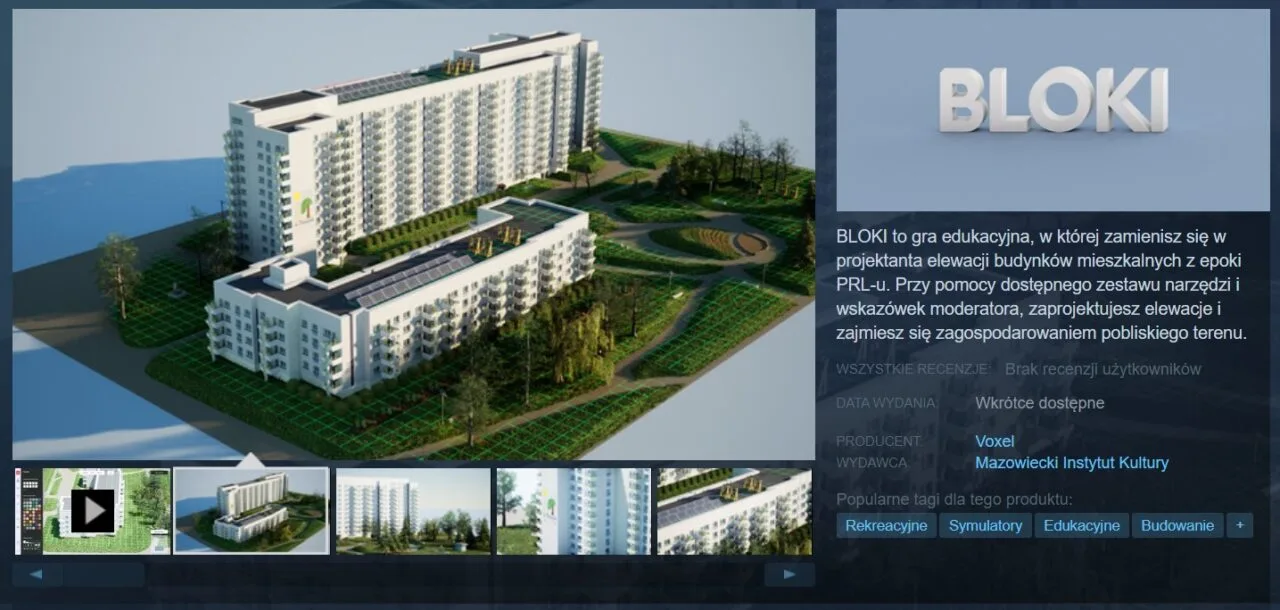 BLOKI to projekt wydany właśnie przez Mazowiecki Instytut Kultury, za którego produkcję odpowiada Bartosz Seifert oraz studio deweloperskie Sky World Games. Głównym założeniem gry jest pozwolenie użytkownikom na odnowienie i przeprojektowanie PRL-owskiego blokowiska.