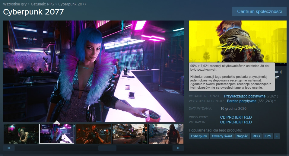 Na temat sukcesu postanowił wypowiedzieć się Marcin Momot, Global Community Director w studiu CD PROJEKT RED. Dał on znać, że gra otrzymała 95% pozytywnych opinii w przeciągu ostatniego miesiąca. To pierwszy tak dobry wynik na platformie Steam w historii projektu, co bez wątpienia należy uznać za niemałe osiągnięcie. Tym samym Cyberpunk 2077 może pochwalić się przytłaczająco pozytywnymi recenzjami – brawo!