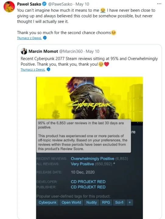 Do wiwatu dołączył również Paweł Sasko, Associate Game Director w CD PROJEKT RED. Nie ukrywa on swojego wzruszenia i tego, jak wiele znaczy dla niego powyższy wynik. Pracownik studia jasno dał do zrozumienia, że przy tworzeniu gry był bardzo blisko poddania się, ale zawsze miał nadzieję, iż zobaczy globalne docenienie jego starań. Deweloper oczywiście nie zapomniał o podziękowaniu użytkownikom, którzy dali zespołowi drugą szansę.