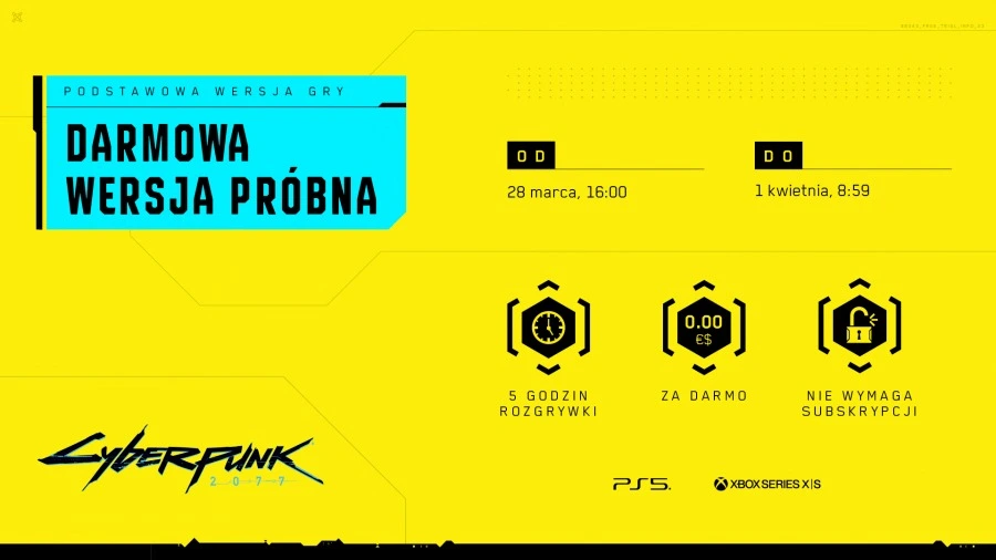 CD PROJEKT RED poinformował o tym, że Cyberpunk 2077 za darmo będzie dostępny od 28 marca, 16:00 do 1 kwietnia, 8:59. Podjęto decyzję o przygotowaniu specjalnej wersji próbnej, którą można pobrać bezpłatnie i testować przez określony czas. Podstawowym warunkiem jest jednak posiadanie konsoli PlayStation 5 lub Xbox Series X/S – niestety z oferty nie skorzystają PC-towi użytkownicy. Dlaczego? Żadne konkrety niestety nie padło, wspomniano wyłącznie o ograniczeniach technicznych.