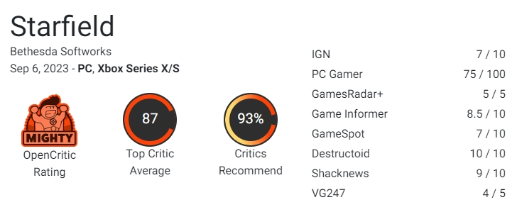 Ta właśnie nadeszła i jest… bardzo dobrze, choć do ideału nieco brakuje. Jeśli zajrzymy na portal Metacritic, to ujrzymy kolejno 88 (PC) i 87 (Xbox Series X/S) punktów dla najnowszego dzieła Bethesdy. Najwięcej punktów (100) hiszpański oddział redakcji IGN, który stwierdził, że Starfield daje graczom „o wiele więcej, niż mogli się spodziewać”. To bardzo ogólne stwierdzenie, więc przyjrzyjmy się szczegółom.