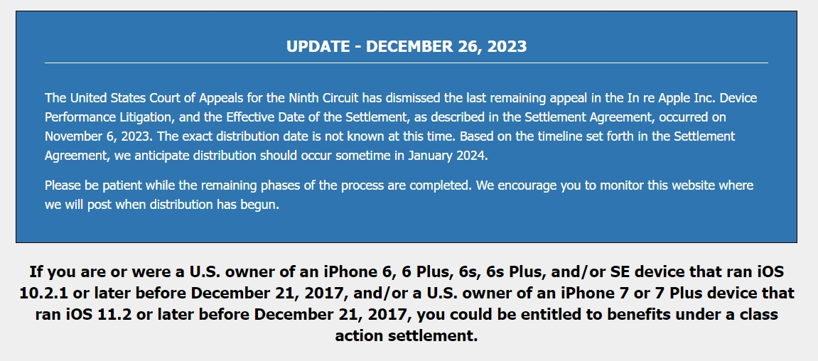 No dobra, ale kto może ubiegać się o zwrot z puli 500 milionów dolarów? Mowa tu wyłącznie o mieszkańcach Stanów Zjednoczonych posiadających iPhone’a 6, iPhone’a 6 Plus, iPhone’a 6s, iPhone’a 6s Plus i/lub iPhone’a SE z systemem iOS 10.2.1 lub nowszym i/lub iPhone’a 7 lub iPhone’a 7 Plus z systemem iOS 11.2 lub nowszym. Istotna jest jednak data, ponieważ taki smartfon należało posiadać przed 21 grudnia 2017 roku. Wnioski o płatność można było natomiast składać do października 2020 roku.
