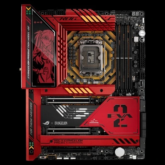 Powyżej widzicie płytę główną ASUS ROG Maximus Z790 Hero EVA-02 Edition wraz z wizerunkiem jednej z głównych bohaterek. Asuka to jednak nie jedyny wyróżniający się aspekt. Mowa tu o napisie EVANGELION PRODUCTION MODEL-02, który sam w sobie nie wzbudza żadnej sensacji. Problem leży jednak w tym, że część osób otrzymała egzemplarz, gdzie dodano dodatkową literę, co możecie zobaczyć poniżej. Tak właśnie powstał „EVANGENLION”.