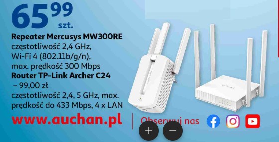 Inna kusząca propozycje to repeater Mercusys MW300RE. Wzmacniacz sygnału działający w technologii Wi-Fi 4 i w paśmie 2,4 GHz może pomóc poprawić zasięg internetu w domu. Cena to 65,99 złotych. Nieco drożej, bo za 99 złotych, sprzedawany jest router TP-Link Archer C24. To niezła alternatywa dla naprawdę starych routerów, oferująca dwuzakresowe Wi-Fi.