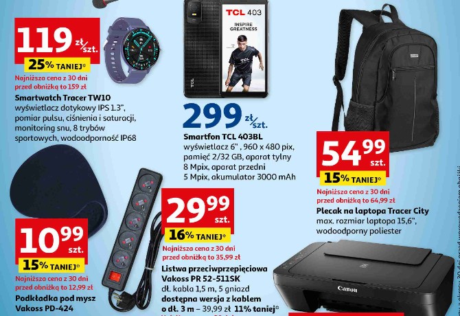 Na wyprzedaży są też smartwatch Tracer TW10 za 119 złotych, tani smartfon TCL 403BL za 299 złotych oraz plecak na laptopa Tracer City w cenie 54,99 złotych. Jest jeszcze podkładka pod mysz Vakoss PD-424 za 10,99 złotych, która wydaje się za mała do wygodnego korzystania.