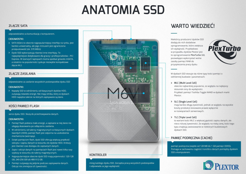 SSD to skrót od Solid State Drive, jednak w Polsce przyjęło się określenie dysk półprzewodnikowy. Ma to związek z brakiem elementów mechanicznych i wykorzystaniem pamięci NAND flash. Dla porównania – klasyczne dyski HDD do przechowywania danych korzystają z wirujących talerzy magnetycznych, dlatego też podczas swojej pracy potrafią hałasować.