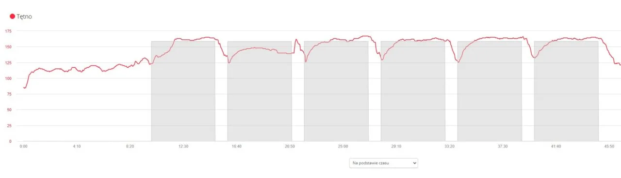 Pokuszę się o dodatkowe pomiary, które obrazują problemy z pomiarem HR w zegarkach Garmin. Zerknijcie tylko na poniższy wykres, który otrzymałem od Mateusza. Na trzecim sprincie pomiar HR z nadgarstka ewidentnie „zawiesił się” na ok. 5 minut rejestrując wyższą aktywność dopiero po zakończeniu tego fragmentu aktywności.