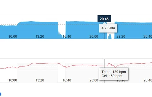 Najpierw Mateusz z naszej redakcji zwrócił moją uwagę na fakt, iż jego Garmin Forerunner 965 ma problemy z poprawnym rejestrowaniem jego tętna. Problem występował zwłaszcza wtedy, gdy Mateusz w trakcie swoich maratońskich przygotowań brał się za bardziej wymagające jednostki treningowe. Jego urządzenie mocno zaniżało pomiar tętna i nie reagowało na jego szybki wzrost. Dopiero po przejściu do marszu tętno rosło, aby po chwili spadać. Nie chodziło o drobną zwłokę liczoną w sekundach, a w minutach i różnicę nawet 20-30 uderzeń serca na minutę.