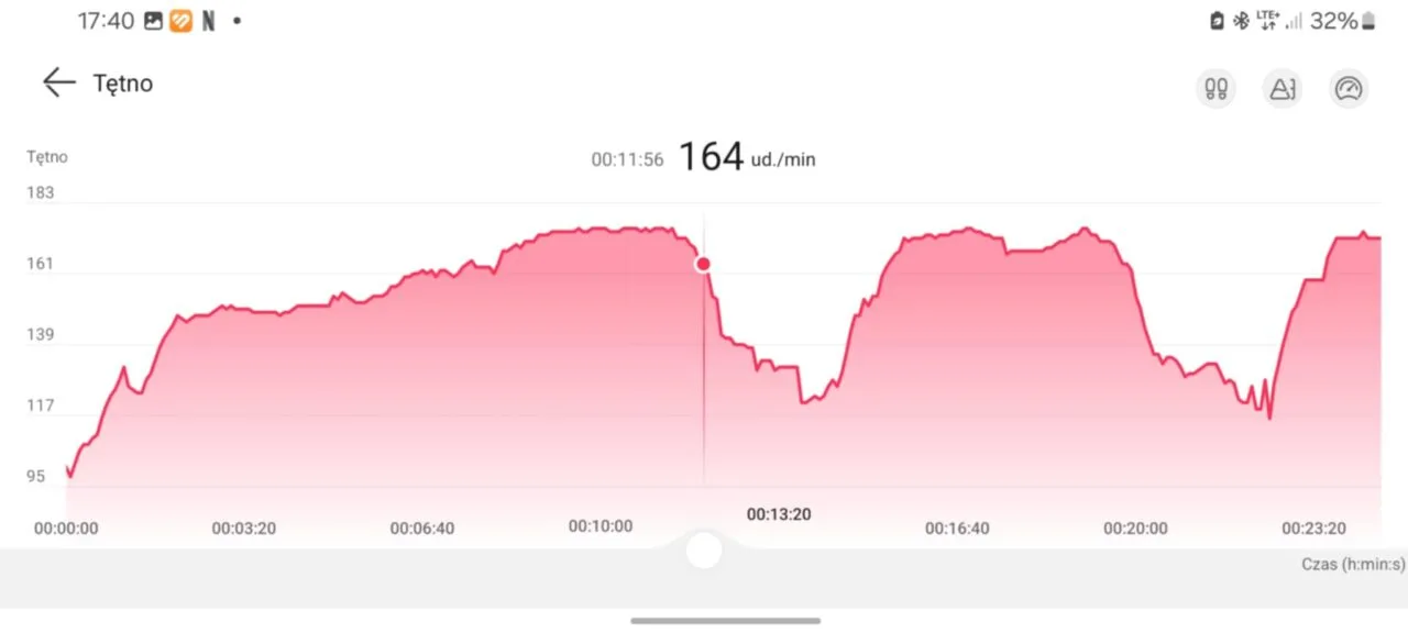 Poniżej: Garmin Fenix 7S vs Huawei Watch GT 5 – jedno z porównań Ani z 21 września 2024 roku. Garmin zaniża tętno na początku treningu (pomiar zupełnie niezgodny z samopoczuciem). Jeszcze rok temu w porównaniach zegarków Garmin i Huawei nadgarstkowy pomiar tętna był niemal identyczny, a różnice w zasadzie pomijalne – trudno było ocenić, który zegarek mierzy go dokładniej bez sięgnięcia po certyfikowane medyczne urządzenie pomiarowe.