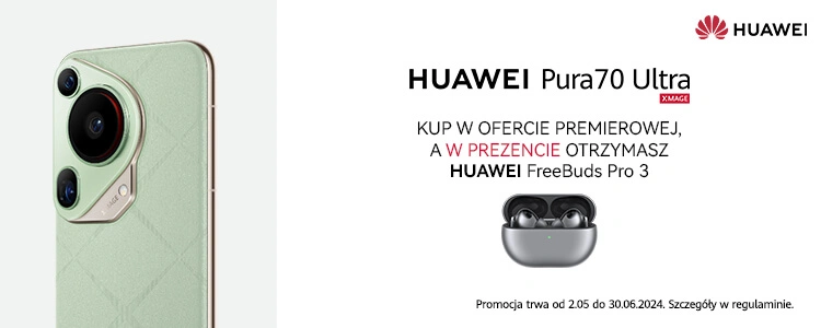 Od 2 maja do 30 czerwca 2024 r. trwa specjalna oferta przedsprzedażowa i premierowa (w zależności od modelu i Sprzedawcy), w ramach której nabywcy dowolnego smartfonu HUAWEI z serii Pura 70 otrzymają w prezencie (lub za 1 zł) słuchawki HUAWEI FreeBuds Pro 3, o wartości 899 zł.