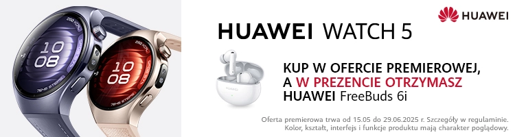 W okresie od 15 maja do 29 czerwca 2025 r., na huawei.pl oraz u Partnerów Biznesowych, wszystkie wersje HUAWEI WATCH 5 są dostępne w specjalnej ofercie premierowej, w ramach której pierwsi nabywcy otrzymają słuchawki HUAWEI FreeBuds 6i o wartości 399 zł w prezencie (lub za 1 zł).