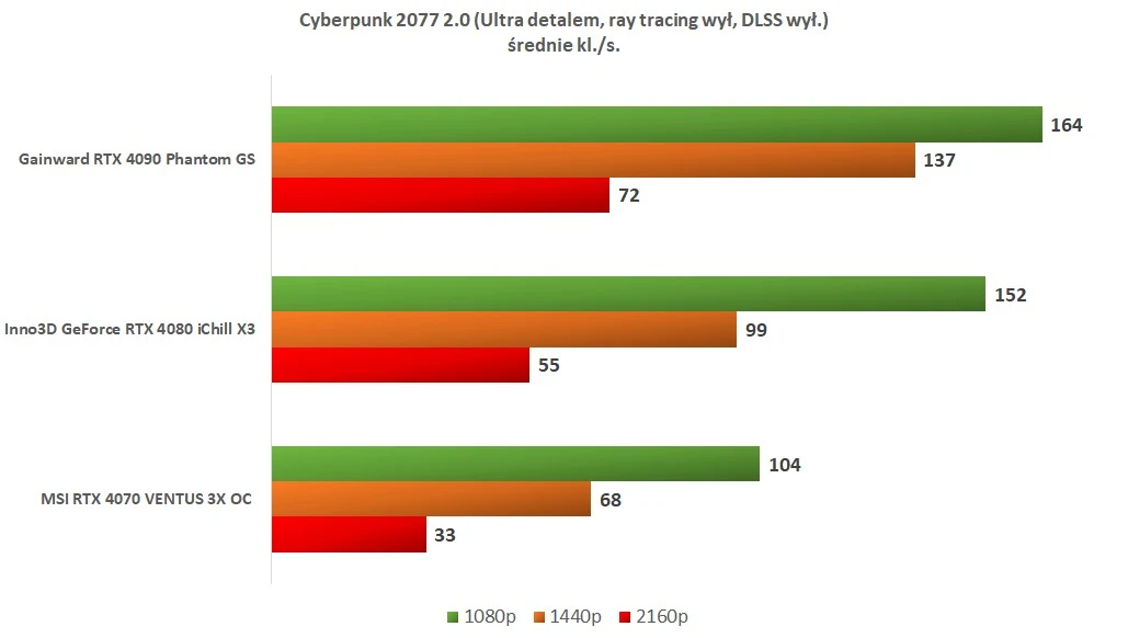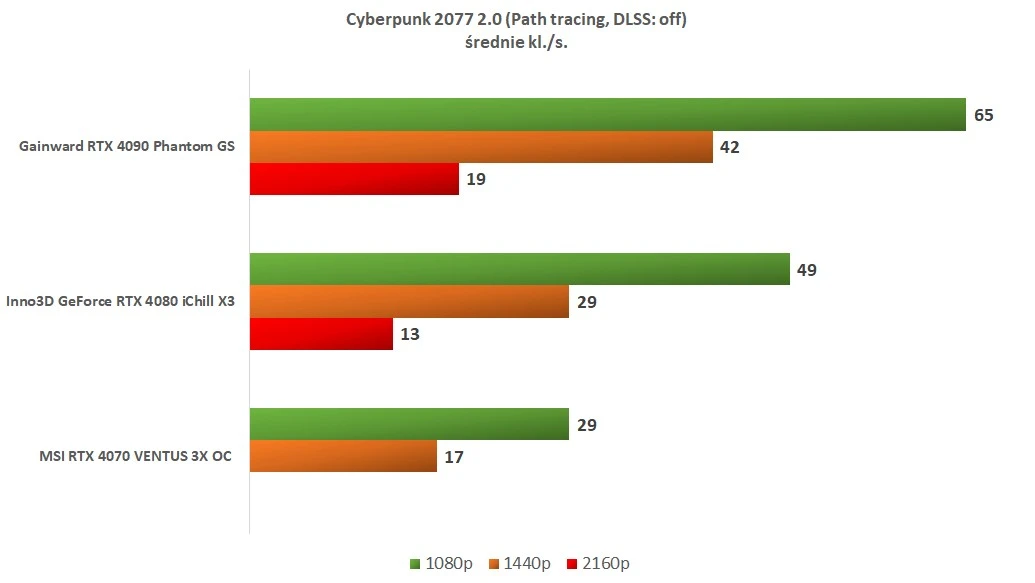 Bez NVIDIA DLSS i ray tracingu jedynie RTX 4090 oraz RTX 4080 potrafią poradzić sobie z zapewnieniem satysfakcjonującej płynności rozgrywki w rozdzielczości 4K w ultra detalach. RTX 4070 zapewnia wtedy iście… „konsolowe” doświadczenia. W niższych rozdzielczościach każda z kart gwarantuje płynność na poziomie ponad 60 klatek na sekundę.