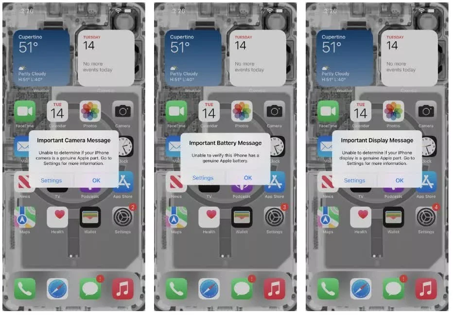 Jeśli technicy nie wykonają odpowiednich kroków lub stosowane przez nich zamienniki nie są fabrycznie nowymi częściami Apple, powoduje to wyświetlenie flagi oprogramowania ograniczającej funkcjonalność urządzenia. iFixIt pokazało przykłady komunikatów ostrzegawczych, dotyczących trzech zamienników – modułu aparatu, ekranu i baterii. Te zostały oflagowane, a iPhone wyświetlał niepokojące alerty informujące o tym, że system nie może zweryfikować oryginalności części (poniżej).