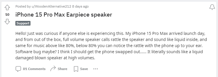 Jedna z osób wspomina, iż otrzymała model Pro Max w momencie premiery i już przy pierwszej próbie testowania głośników wręcz przeraziła się jakością dźwięku. Niektórzy dają znać, iż sytuacja ma miejsce przy określonych filmach bądź konkretnych zakresach częstotliwości. Pojawiają się porównania do głośników zalanych cieczą.