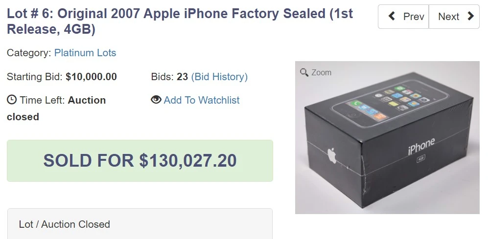 Niejednokrotnie dawaliśmy Wam znać o aukcjach osiągających zawrotne sumy. Zazwyczaj w grę wchodzą stare urządzenia praktycznie nienaruszone przez ząb czasu. Właśnie jesteśmy świadkami takiej sytuacji, gdy oryginalny iPhone został sprzedany za 130 tys. dolarów, czyli około 515 tys. złotych. Co prawda nie mówimy jeszcze o rekordzie, ale wciąż mamy do czynienia z wydarzeniem wartym uwagi. Trudno bowiem przejść obojętnie obok zapieczętowanego smartfona sprzed siedemnastu lat.