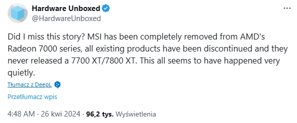 Część osób zapewne nie będzie szczególnie zaskoczona. MSI od pewnego czasu niespecjalnie skupia się na promocji kart AMD i raczej przedłuża ich produkcję. Do tego wszystkiego dochodzi brak wydania własnej wersji kart graficznych RX 7700 XT oraz RX 7800 XT. Sporo rzeczy wskazywało na niezbyt optymistyczny obrót spraw. Właśnie mamy chyba do czynienia z realizacją takiego scenariusza.
