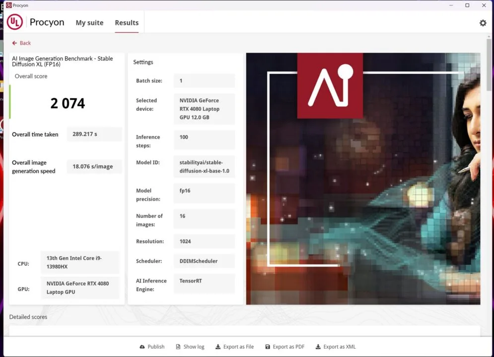 - UL Procyon AI Image Generation Benchmark (Stable Diffusion XL) – 2074 punkty