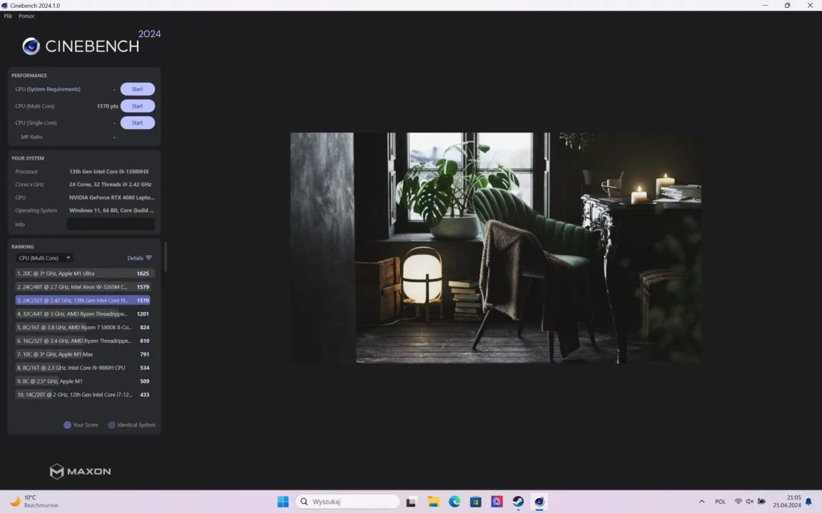 - Cinebench (Multi Core) – 1570 punktów