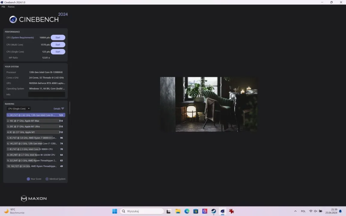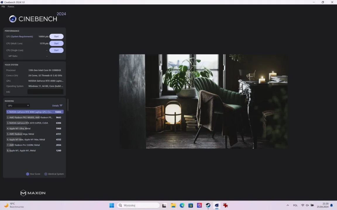 - Cinebench (GPU) – 16604 punkty