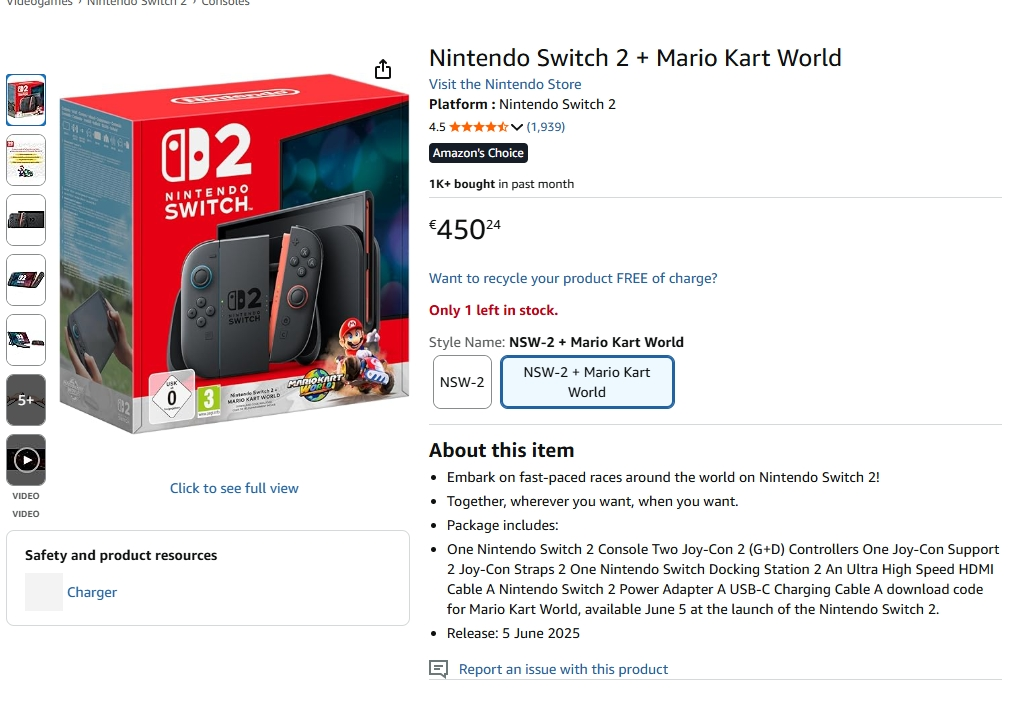 W tej chwili Nintendo Switch 2 jest sprzedawane przez francuski Amazon w cenie zaledwie 419 euro (około 1780 złotych), a w pakiecie z grą Mario Kart World za 469 euro (około 2000 złotych). Tak, mowa o zupełnie nowych egzemplarzach konsoli, z pełną gwarancją. Co najlepsze, można je zamówić do Polski, a dostawa nie kosztuje dużo, bo 4,62 euro (około 20 złotych).