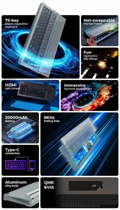 Producent obiecuje ekran dotykowy cechujący się odświeżaniem 60 Hz oraz rozdzielczością 3840 x 1100. Nie brakuje oczywiście baterii 20 000 mAh mającej wytrzymać na jednym ładowaniu maksymalnie 12 godzin. Do tego dochodzą wbudowane głośniki oraz wejście HDMI umożliwiające przekształcenie klawiatury w dodatkowy monitor. Urządzenie spodoba się szczególnie osobom, dla których niezwykle istotna jest personalizacja.