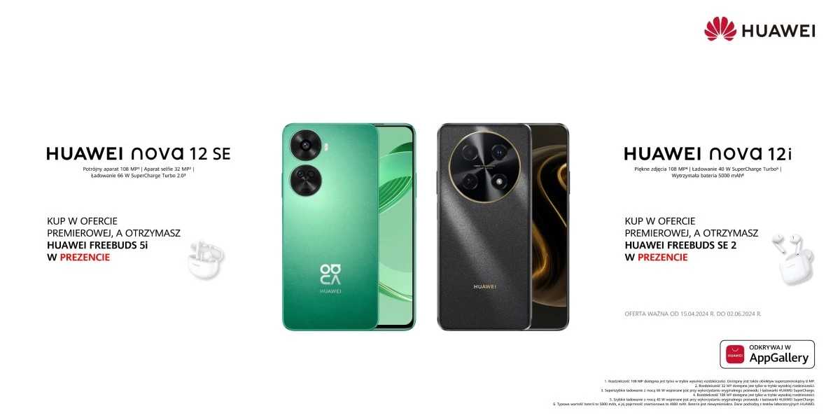 Co więcej, kupujący smartfony w oficjalnym sklepie Huawei.pl mogą skorzystać z opcji smart opaskę HUAWEI Band 8, smartwatcha HUAWEI Fit SE, przedłużenie gwarancji o kolejny rok czy podwojenia punktów w programie lojalnościowym. Na kupujących czeka także powitalny bonus w wysokości 50 złotych za dołączenie do newslettera.