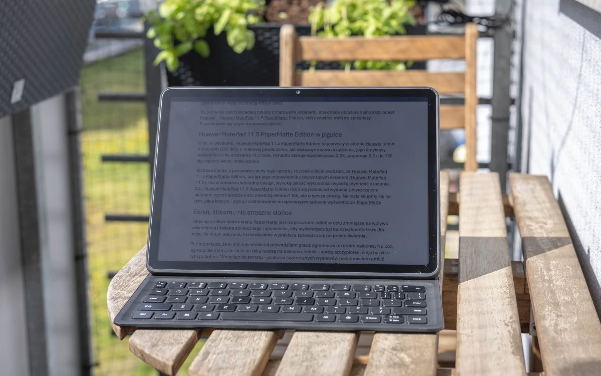 Dzięki matowej powłoce ekran omawianego tabletu cechuje się zaskakująco wysoką czytelnością nawet wtedy, gdy bezpośrednio padają na niego promienie ostro świecącego słońca. Przekonałam się o tym porządnie już dzień później, gdy ponownie zabrałam Huawei MatePad 11.5 PaperMatte Edition na balkon, tym razem aby popracować z tekstem przy znajdującym się tam stoliku, z wykorzystaniem klawiatury HUAWEI Smart Magnetic Keyboard. Wprawdzie najlepiej pisało mi się, gdy akurat na tablet padał mój cień, ale nawet gdy ten nie padał na ekran wcale lub w całości, wciąż pracowało mi się dość przyjemnie. Praca na tablecie z ekranem o błyszczącej powłoce nie byłaby możliwa, właśnie dlatego, że w słonecznych warunkach takie wyświetlacze tworzą mocne refleksy i zamieniają się w zasadzie w lustrzane tafle. Tymczasem ekran PaperMatte takich refleksów nie tworzy.