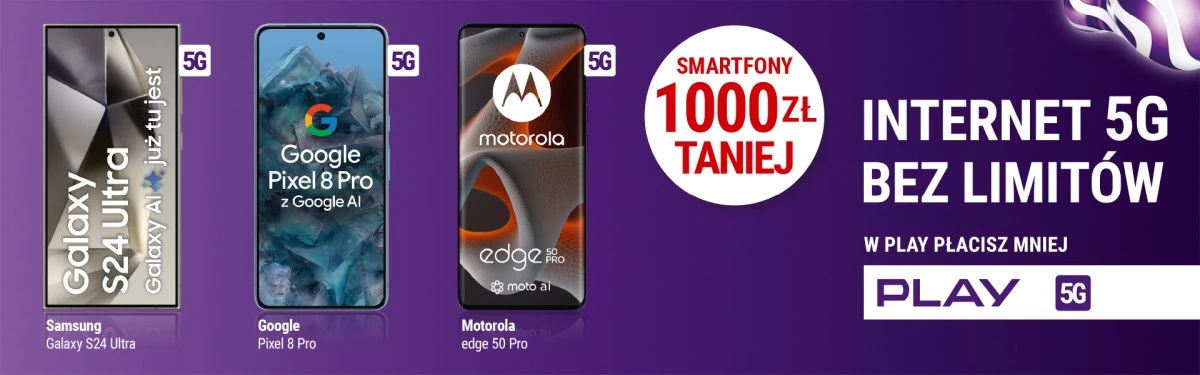 Play przygotował specjalną ofertę dla osób przenoszących numer. Oprócz internetu 5G bez limitów prędkości i danych są nim oferowane smartfony Google Pixel 8 Pro, Motorola Edge 50 Pro i Samsung Galaxy S24 Ultra w cenach niższych o 1000 złotych. Operator pozwala kupić je na raty 0%.