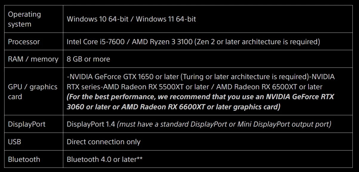 Poznaliśmy także minimalne wymagania sprzętowe PC jeśli chodzi o wykorzystanie PlayStation VR2 – znajdziecie je w poniższej tabeli.