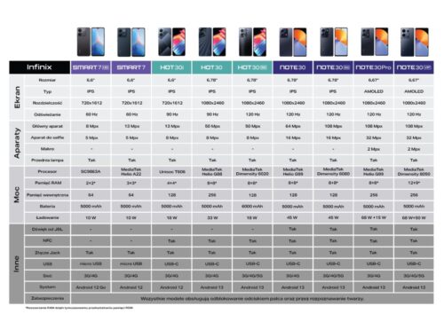 Smartfony z serii NOTE 30 miały swoją premierę w Polsce w drugiej połowie czerwca. Mowa o smartfonach NOTE 30, NOTE 30 5G, NOTE 30 Pro oraz NOTE 30 VIP. Wszystkie cztery urządzenia wykorzystują opracowaną przez Infinix technologię All-Round FastCharge, zapewniającą bardzo szybkie i bezpieczne ładowanie, dźwięk od JBL oraz ekrany z częstotliwością odświeżania ekranu 120 Hz. Zostały również wyposażone w technologię Ultra Power Signal (UPS), która wspiera korzystanie ze smartfonu w miejscach ze słabym zasięgiem, jak windy czy miejsca położone pod ziemią.