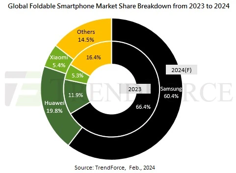 Eksperci prognozują, że 2024 rok nie będzie obfitował w tego typu produkty. Globalny wzrost dostaw i sprzedaży ma spowolnić do 11%, co jest sporą zmianą w stosunku do poprzednich dwunastu miesięcy. Wtedy (porównując wskaźniki rok do roku) mieliśmy do czynienia z wzrostem na poziomie 25%, kiedy to wysłano 15,9 mln składanych smartfonów. Przełożyło się to na 1,4% udziału na całym mobilnym rynku.