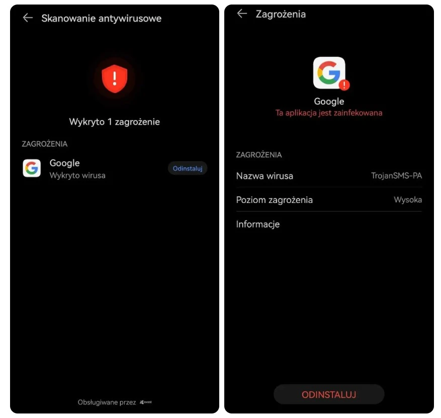 Wykryto, że aplikacja Google wysyła niejawnie wiadomości SMS, zachęca użytkowników do płacenia za treści dla dorosłych, niejawnie pobiera/instaluje aplikacje lub wykrada prywatne informacje, co może doprowadzić do szkód majątkowych lub wycieku poufnych danych (szczegóły ryzyka). Zalecamy jej natychmiastowe odinstalowanie.