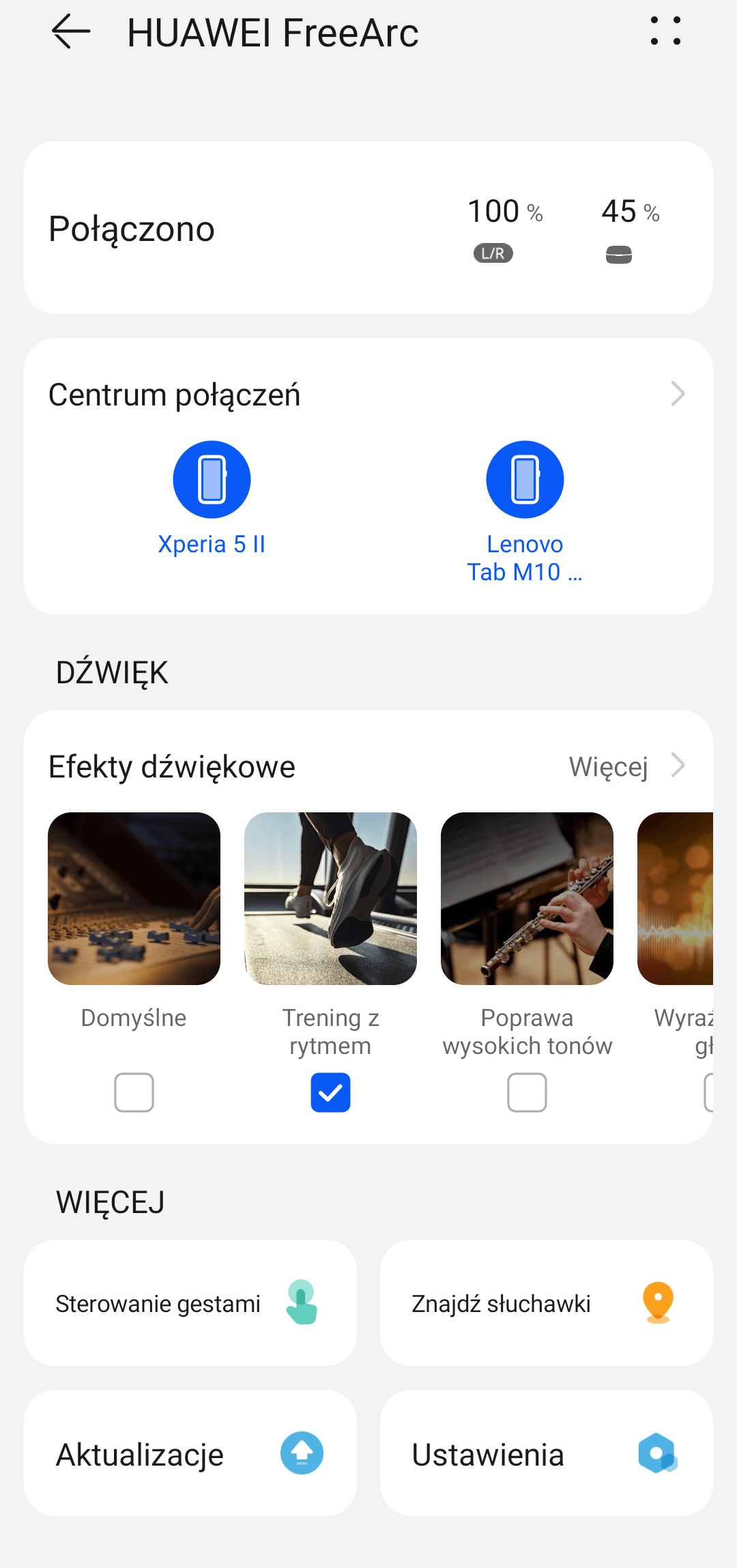 Z jej poziomu możemy również zarządzać skrótami dotyczącymi sterowania gestami, skorzystać z opcji „znajdź słuchawki” lub z efektów dźwiękowych – tryby dźwięku (temat zostanie opisany w dalszej części tekstu).
