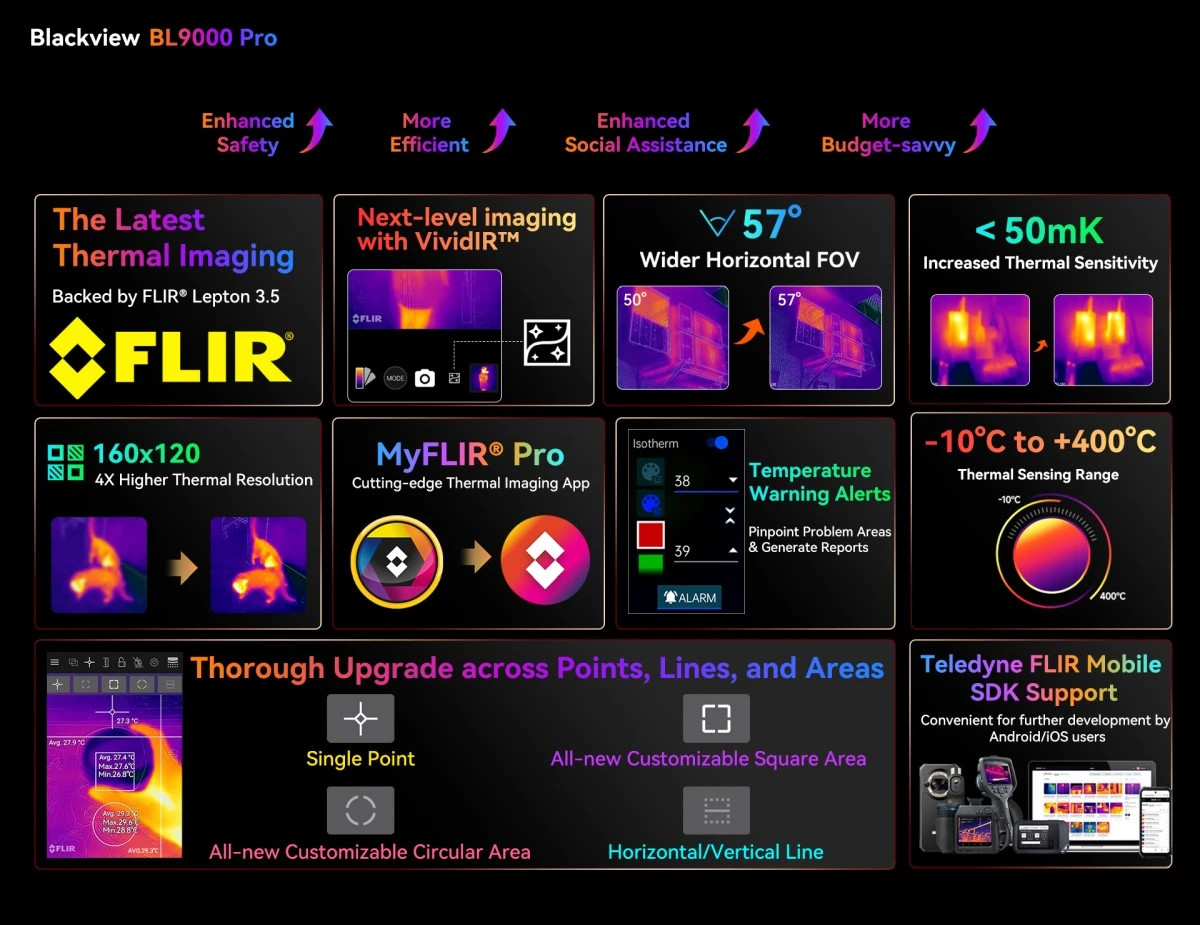 Jedną z ważniejszych cech smartfonu Blackview BL9000 Pro jest kamera termowizyjna, bazująca na czujniku FLIR Lepton 3.5. Oferuje ona termiczną rozdzielczość do 160×120, a dzięki technologii VividIR ma gwarantować termiczne obrazy o zwiększonej ostrości. Kamera ta współpracuje z ulepszoną aplikacją MyFLIR Pro.