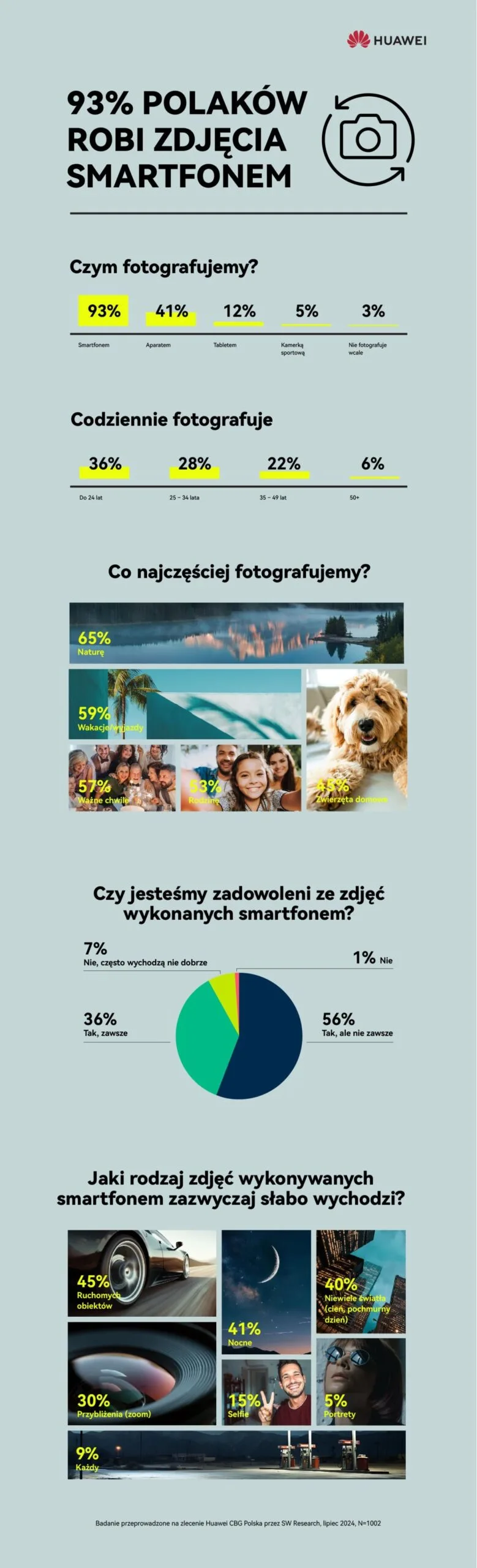 19 sierpnia obchodzimy Światowy Dzień Fotografii. Data nie jest przypadkowa, bowiem to właśnie tego dnia w 1839 roku wykonano pierwsze na świecie zdjęcie w technologii dagerotypii. Dziś każdego dnia ludzkość przechwytuje aż 5 miliardów (!) fotografii, z czego lwią część właśnie za pomocą smartfonów. Swój smartfon do tego celu wykorzystuje aż 93 procent Polaków – a przynajmniej tak wynika z badania Huawei CBG Polska, przeprowadzonego w lipcu 2024 roku na próbie 1002 osób. Tylko 3 procent użytkowników smartfonów deklaruje, że nigdy nie robi nimi zdjęć.