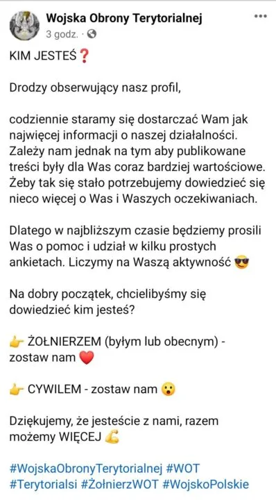 Wczorajszego wieczoru na oficjalnym profilu Wojsk Obrony Terytorialnej na Facebooku pojawił się przedziwny wpis. Widniało w nim wezwanie do tego, internauci za pośrednictwem reakcji przekazali, czy są żołnierzami, czy cywilami. Miało to rzekomo pomóc publikować WOT treści bardziej wartościowe i dopasowane do oczekiwań osób śledzących profil. Problem polegał na tym, że osoby podpisujące się pod reakcjami imiona, nazwiskami i profilami mogły trafić na celownik obcych służb wywiadowczych.
