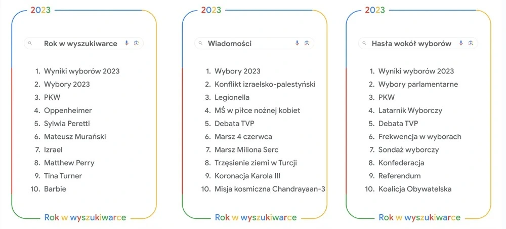 Chyba nikogo nie zdziwi to, że wiodącym tematem w 2023 roku były wybory parlamentarne oraz tematy z nimi związane. Ludzie interesowali się wynikami społecznego zrywu, listą osób biorących w nich udział oraz kontrowersyjną debatą przeprowadzoną w Telewizji Publicznej. Oczywiście nie brakowało kwestii odnośnie do sposobu głosowania, wyglądu karty czy odmowy udziału w referendum. Polacy chcieli również dowiedzieć się o rezultatach wyborów oraz ich wypływu na przyszły wygląd sejmu.
