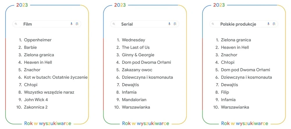 Rozrywka także była mocną stroną Polaków – zwłaszcza że 2023 rok wręcz obfitował w ciekawe wydarzenia. Internauci najczęściej decydowali się na wyszukiwanie informacji o filmach Oppenheimer czy Barbie. W związku z tym ludzie chcieli też dowiedzieć się czegoś odnośnie do zjawiska powszechnie znanego jako Barbenheimer. Brano też pod uwagę inne filmy – sporym zainteresowaniem cieszyła się Zielona granica, Heaven in Hell, Znachor czy Chłopi. Fani seriali mieli natomiast do czynienia z Wednesday, The Last of Us oraz Ginny & Georgie. Na ostatnim miejscu znalazła się natomiast polska Warszawianka.
