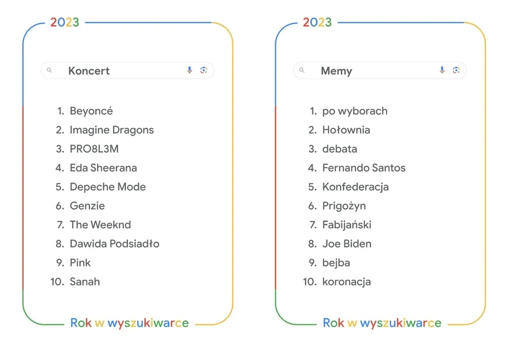 To nie wszystko. Kwestie muzyczne również rozpalały polskich użytkowników. Najczęściej wyszukiwano informacje odnośnie do głośnego koncertu Beyoncé oraz absurdalnie wysokiej ceny za bilety. Polacy chcieli też pozyskać wiedzę odnośnie do Eda Sheerana, Imagine Dragons, Depeche Mode, Pink czy The Weeknd. Na liście znalazły się również polskie akcenty w postaci PR08L3M, Genzie, Dawida Podsiadły czy Sanah.