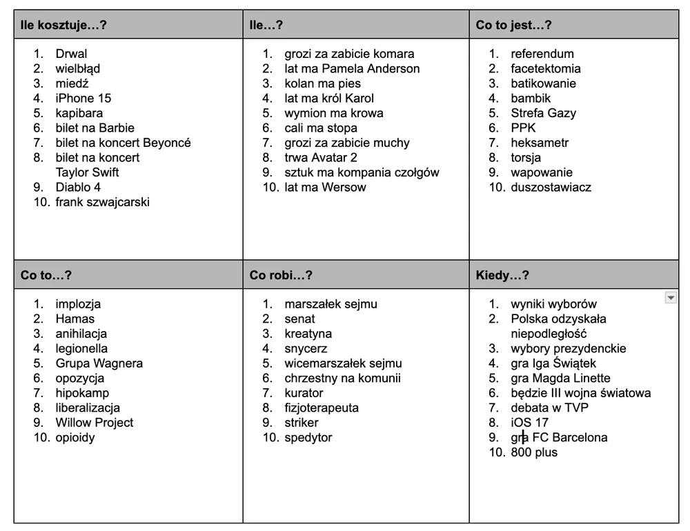 Polaków intrygowała również tegoroczna cena kanapki Drwal czy smartfona iPhone 15. Rodacy obawiali się również kary za zabicie komara oraz zastanawiali się ile kolan ma pies. Oprócz tego chcieli upewnić się co do roli marszałka sejmu, senatu czy chrzestnego na komunii. Nie wiedzieli przy okazji, gdzie jest prostata i Westerplatte. Poprawiali przy okazji swoją wiedzę kulinarną poprzez wyszukiwanie sposobu ugotowania ryżu na mleku czy bobu.