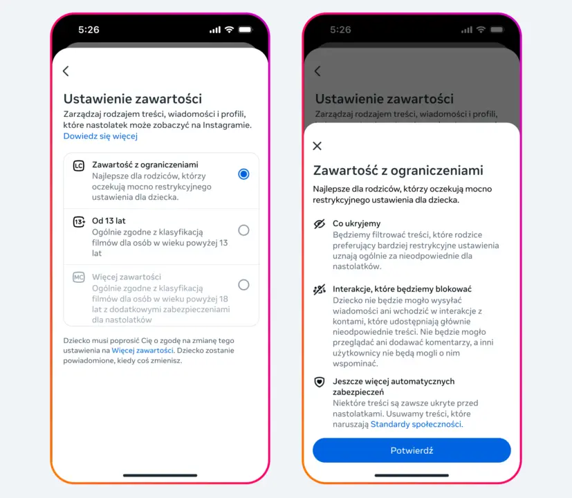 Dodatkowo Meta wprowadza tryb „Ograniczone treści”, który pozwala rodzicom i opiekunom jeszcze dokładniej kontrolować poczynania nastolatków na Instagramie. Dzięki temu młodzi użytkownicy zobaczą mniej postów, a niektóre kategorie materiałów mogą być dla nich całkowicie ukryte. Ponadto nie będą mogli komentować treści ani wyszukiwać określonych słów kluczowych. To da rodzicom poczucie większej kontroli nad tym, co ich dzieci oglądają i z kim wchodzą w interakcje. Tryb ten jest odpowiedzią na potrzeby tych rodzin, dla których standardowe filtry 13+ mogą być nadal zbyt liberalne.